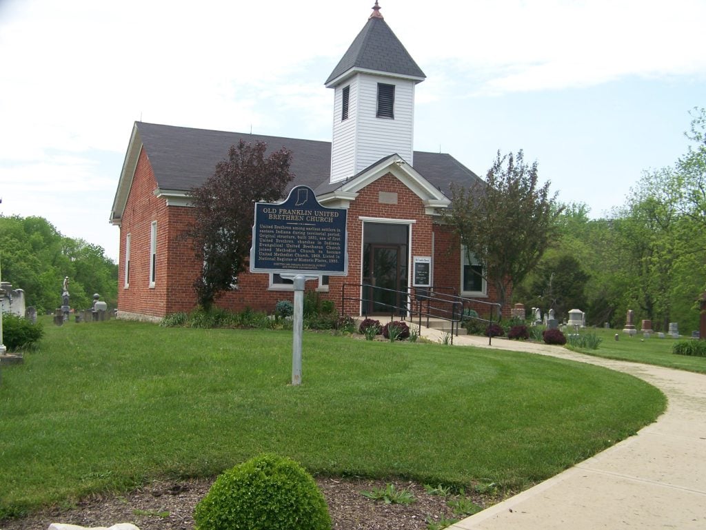 The church was organized through the efforts of Henry Fry, an early Hoosier settler and his old friend Bishop Henry Kumler Sr. in 1824. Meetings were held in the Fry home until the church was built in 1831. The red brick building is surrounded by tombstones, with some of the founding fathers of the community and the Church buried in the adjoining cemetery. John G. and Catherine Koerner, who were charter members of the church and were the maternal grandparents of Orville and Wilbur Wright, are also buried in the cemetery.